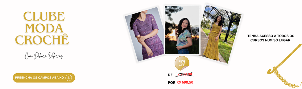 Tenha acesso a todos os cursos num só lugar. São mais de 70 cursos de vestidos, blusas, conjuntos, casacos, saias e macacões em crochê.